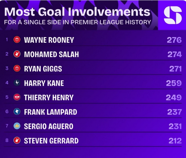 9月21日讯 Squawka统计了球员在单一球队加入 英超得分 的数量,并列出榜单,足球直播无插件免费在线观看萨拉赫加入 274球排名第二位,距离首位鲁尼仅差2球。
