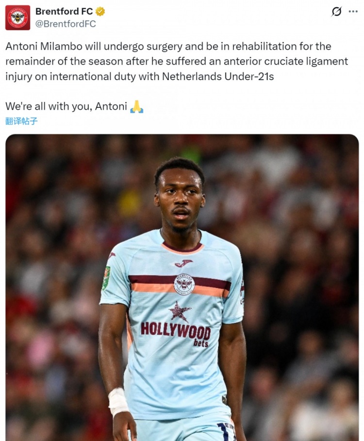 10月15日讯 布伦特福德官方确认,队内20岁中场球员米兰博前交叉韧带(十字韧带)负伤 。