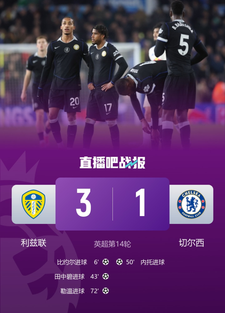 直播吧12月4日讯北京时间12月4日凌晨4:15,英超第14轮英超足球现场直播在线直播观看免费,切尔西做客埃兰路运动活动 场 对阵利兹联。上半场,比约尔顶球破门为利兹联取得领跑 ,田中碧世界波破门扩大比分优势!埃斯特旺违例 染黄!半场战罢,切尔西暂0-2利兹联;下半场,内托破门扳回一球,帕尔默后备 出场,勒温抓住阿达拉比奥尤错误 破门!全场赛事 结束,切尔西1-3利兹联!
