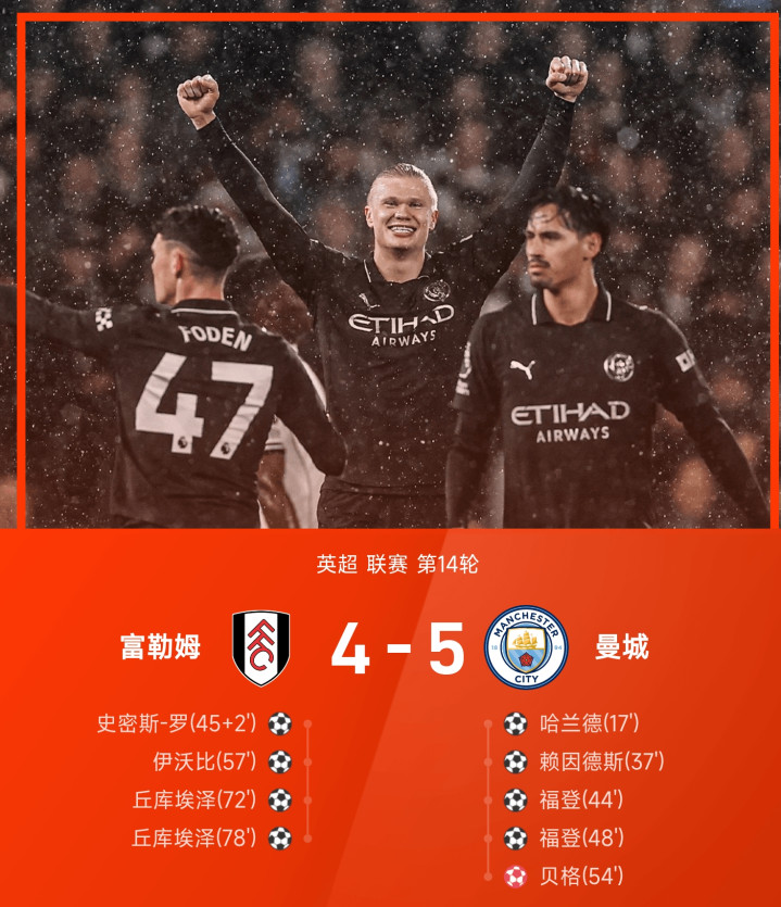 25/26赛季英超职业联赛 第14轮,富勒姆对阵曼城。第17分钟,多库传中,哈兰德推射破门,曼城率先打破僵局。第37分钟,哈兰德助功 赖因德斯单刀赴会挑射破门。第44分钟,福登危险区域 外世界波破门。上半场补时第2分钟,威尔逊助功 史密斯-罗顶球得手,半场曼城3-1领跑 富勒姆。第48分钟和第54分钟,福登抢点破门、贝格不慎乌龙球,曼城将比分扩大到5-1。随后赛事 进入富勒姆时间,第57分钟,伊沃比危险区域 外精准推杆直窜古代足球 门 右下角。第72分钟,丘库埃泽爆杆抽射打进远角,VAR确认得分 有效。第78分钟,丘库埃泽爆杆抽射再扳一球。最终曼城在客场应战 5-4险胜富勒姆,本轮先赛的情况下,曼城暂追赶 榜首2分。