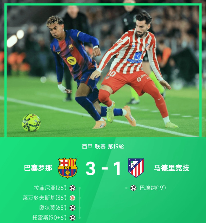 12月3日 25-26赛季西甲职业联赛 第19轮,巴塞罗那坐镇诺坎普运动活动 场 迎战马德里竞赛 。此役上半场英超联赛直播免费,巴埃纳接应传送球 突入危险区域 单刀赴会破门,拉菲尼亚接应直塞晃过守门员推空门积分 ,奥尔莫造点但莱万多夫斯基将十二码球踢飞。易边再战,奥尔莫危险区域 中路接盘带 随即左脚抽射破门,托雷斯补时阶段再入一球。全场赛事 结束,巴塞罗那3-1反转 马德里竞赛 ,继续领跑积分榜。