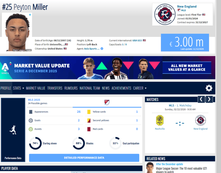美国职业古代足球 大联盟冬季转会市场上最引人瞩目的潜在交易可能是备受瞩目的美国青年国脚左后场球员佩顿-米勒(PeytonMiller)。他16岁时就赢得了新英格兰革命队的杆位位置,如今刚满18岁的他可以前往欧洲进步 。