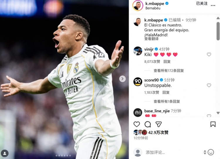 本场赛事 姆巴佩破门,赛后他也在个人社媒晒出庆祝得分 照片,欧洲杯直播吧配文写道:“国家德比获胜 属于我们体育直播体育直播在线观看,球队展现出很棒的生气 ,皇马助威 !”