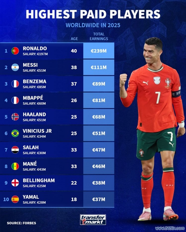 10月18日讯 德国转会市场统计了球员2025年的收入,并列出榜单,C罗2.39亿欧居首,梅西1.11亿欧次席。